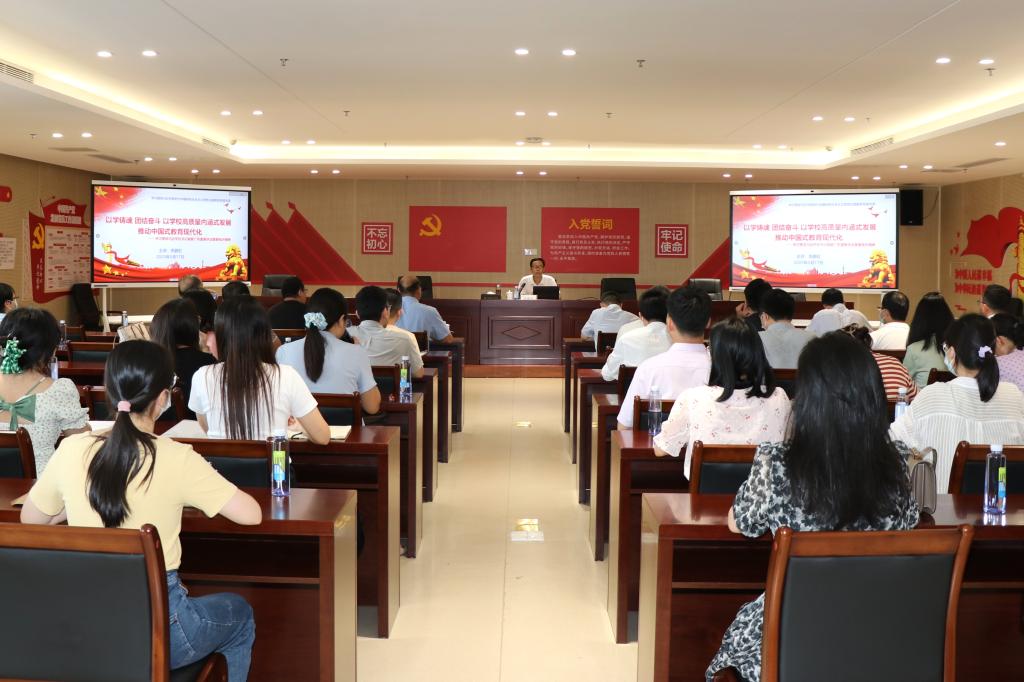 5月17日下午,校区管委会委员、工会主席、组织人事部负责人李鹏虹在海纳楼520党员活动室以《以学铸魂,团结奋斗,以学校高质量内涵式发展推动中国式教育现代化--学习贯彻习近平总书记视察广东重要讲话重要指示精神》为题,讲授学习贯彻习近平新时代中国特色社会主义思想主题教育专题党课。组织人事部和基础部全体人员、民主党派、无党派人士、归国教职工代表参加专题党课学习。