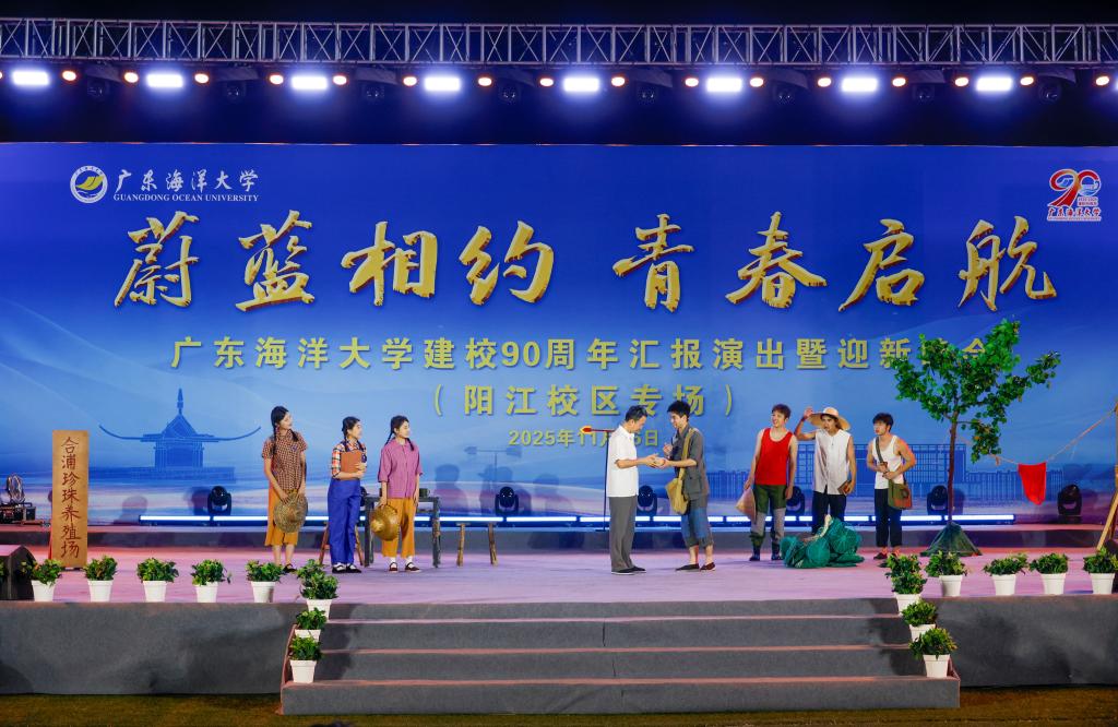 晚会以阳江校区师生合唱《国家》《蔚蓝之歌》拉开帷幕,围绕校庆与迎新主题展开三个篇章。第一篇章“蔚蓝印记・九秩芳华”通过话剧《南珠之光》呈现熊大仁教授践行“中国不成为珍珠王国,死不瞑目”誓言的传奇人生,让师生深切感悟老一辈海大人的家国担当,配合民族舞《石榴红了》与街舞《we young》,展现海大精神传承与青春朝气。第二篇章“青春逐浪・芳华绽放”以话剧《海上粮仓的守护者》讲述卢伙胜教授扎根南海坚守科研,助力“海上粮仓”落地的感人事迹,结合武术与笛乐《墨武丹青 笛绘春秋》、中国舞《石窟・日月》及荧光秀《光影绘蔚蓝》,彰显学子多元才艺。第三篇章“蔚蓝启航・逐梦新程”中,师生朗诵《又一片海洋》触摸校史中的蔚蓝印记,聆听新一代海大人的启航心声,街舞《Heated Waves》与歌曲串烧《我爱海大》点燃全场热情,表达对母校的深情祝福与新征程的向往。