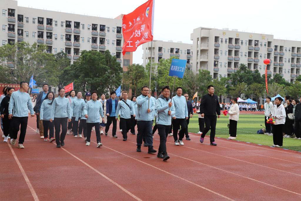 伴随着激昂的旋律,国旗队、校旗队、红旗队、裁判员方队以及机关联合工会方队、各学院方队依次入场。本届运动会共设20个学生组项目、11个教工组项目,5支学生代表队和7支教工代表队近400名运动员参赛。