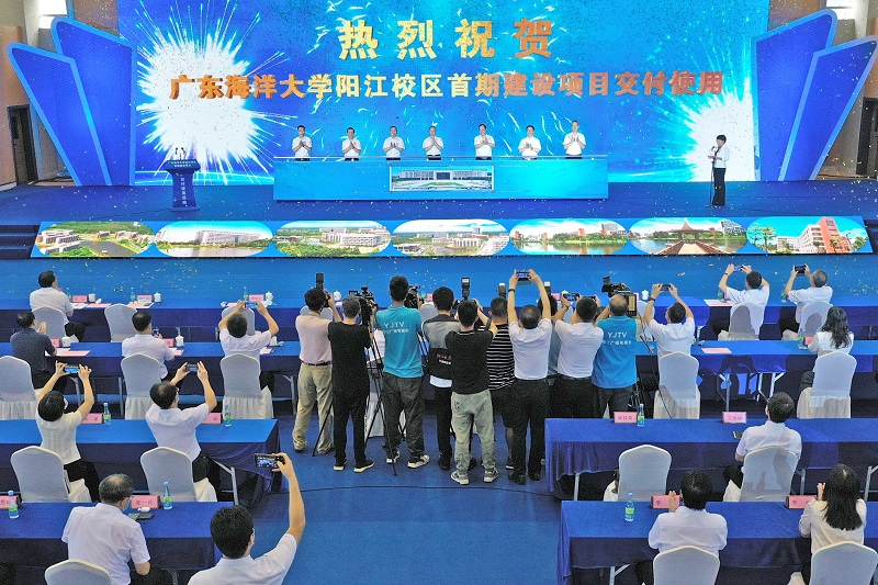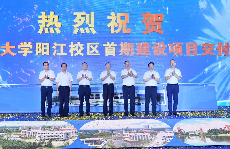 活动现场,省教育厅二级巡视员朱俊文,校党委书记曹俊明,校长潘新祥,阳江市委书记林道平,华南理工大学党委书记章熙春,阳江市政协主席杨文龙,阳江市委常委、常务副市长李勇毅共同推杆完成欧冠官方网站阳江校区首期项目交付。