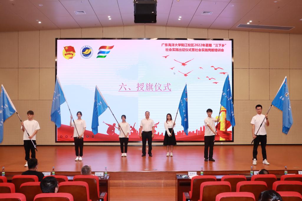 阳江校区党委副书记、管委会常务副主任周昌仕在出征仪式上作动员讲话,并为2022年寒假“返家乡”社会实践优秀团队颁奖和为2022年暑期“三下乡”社会实践团队代表授旗。各社会实践团队临时团支部书记现场重温入团誓词表达了团员青年高扬理想,坚定信念,积极投身祖国建设的决心。