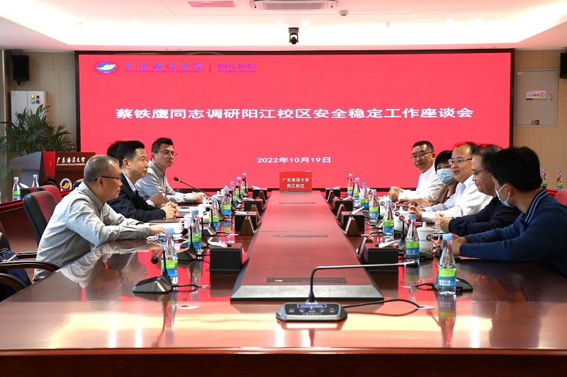 10月19日,阳江市委常委、政法委书记蔡铁鹰率队到欧冠官方网站阳江校区调研校园安全稳定工作。在校区党委副书记、管委会常务副主任周昌仕的陪同下,调研组到厚为楼、商学院、监控室和图书馆察看,接着召开座谈会并听取有关工作汇报。