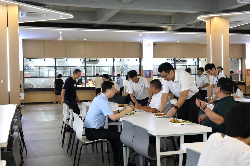蔡铁鹰一行深入校园24小时监控室、教学楼和桃李食苑、嘉禾食苑等地进行现场调研,详细了解校区监控设施、学生学习环境以及校园食品安全等情况,并在食堂进行陪餐。调研组一行在嘉禾食苑一楼大众窗口排队、点菜、打饭,与同学们共进晚餐。