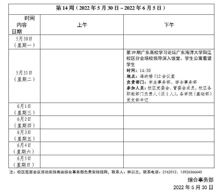 2021~2022学年第二学期第14周会议活动安排表