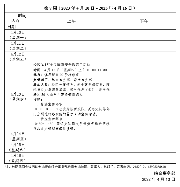 上一篇:2022~2023学年第二学期第08周会议活动安排表