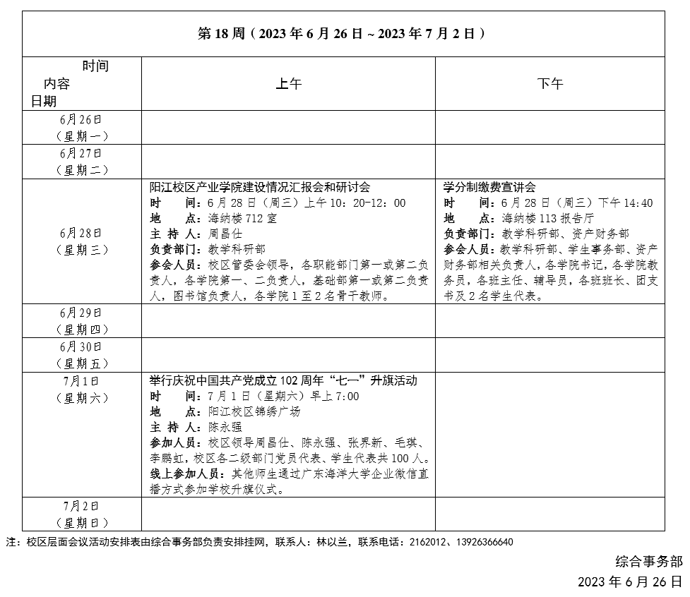 2022~2023学年第一学期第18周会议活动安排表