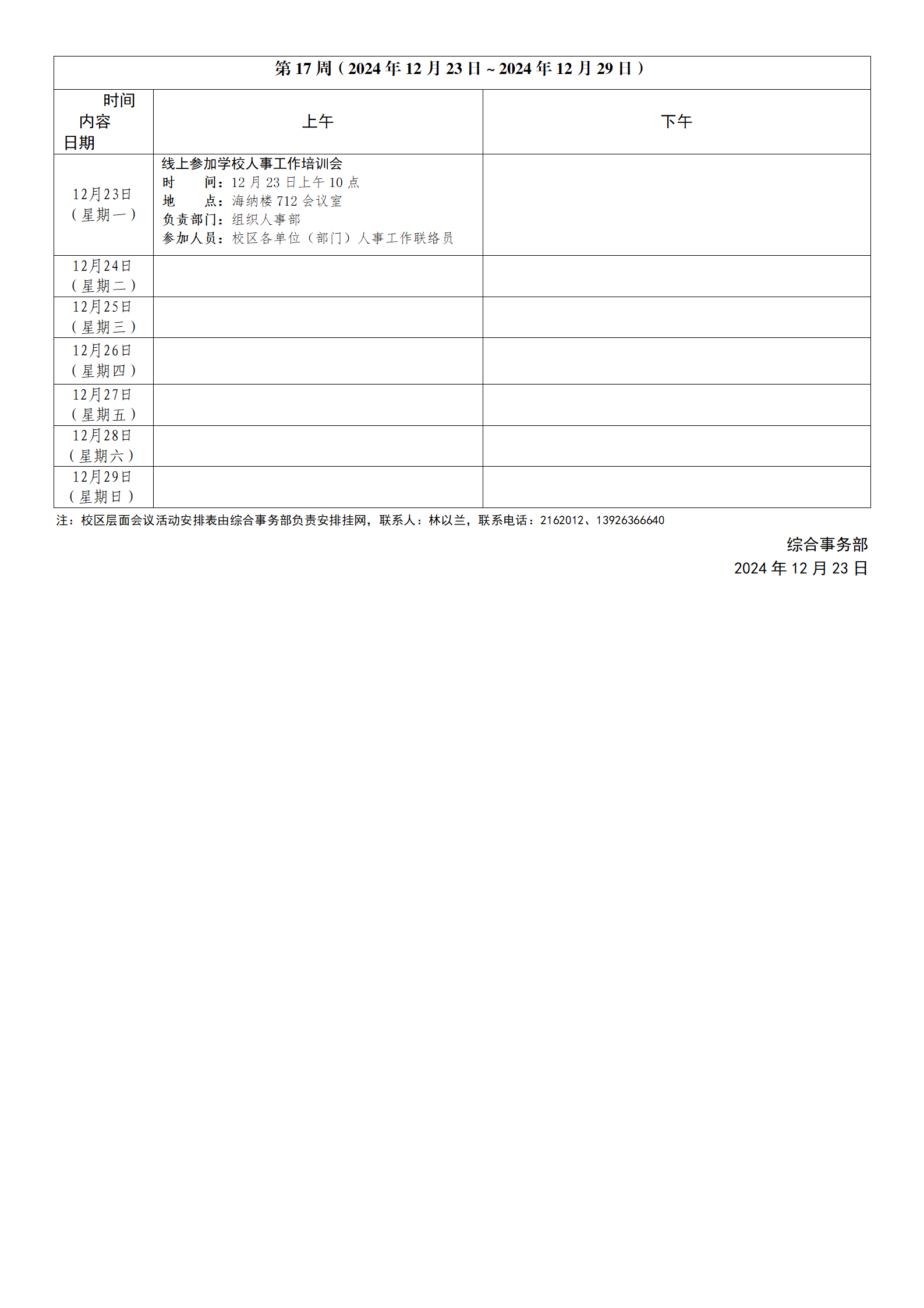 2024~2025学年第一学期第17周会议活动安排表