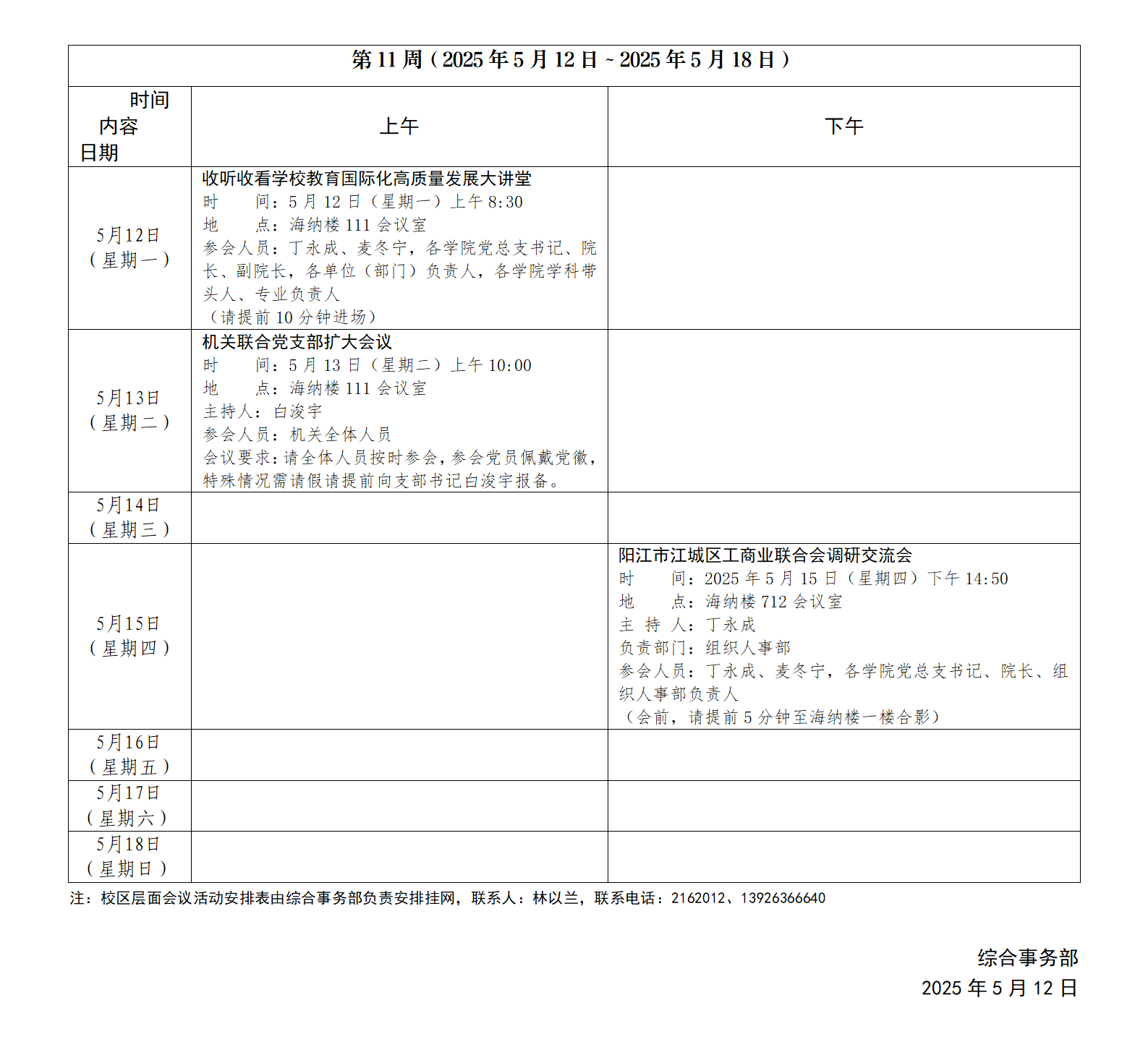 2024~2025学年第二学期第11周会议活动安排表